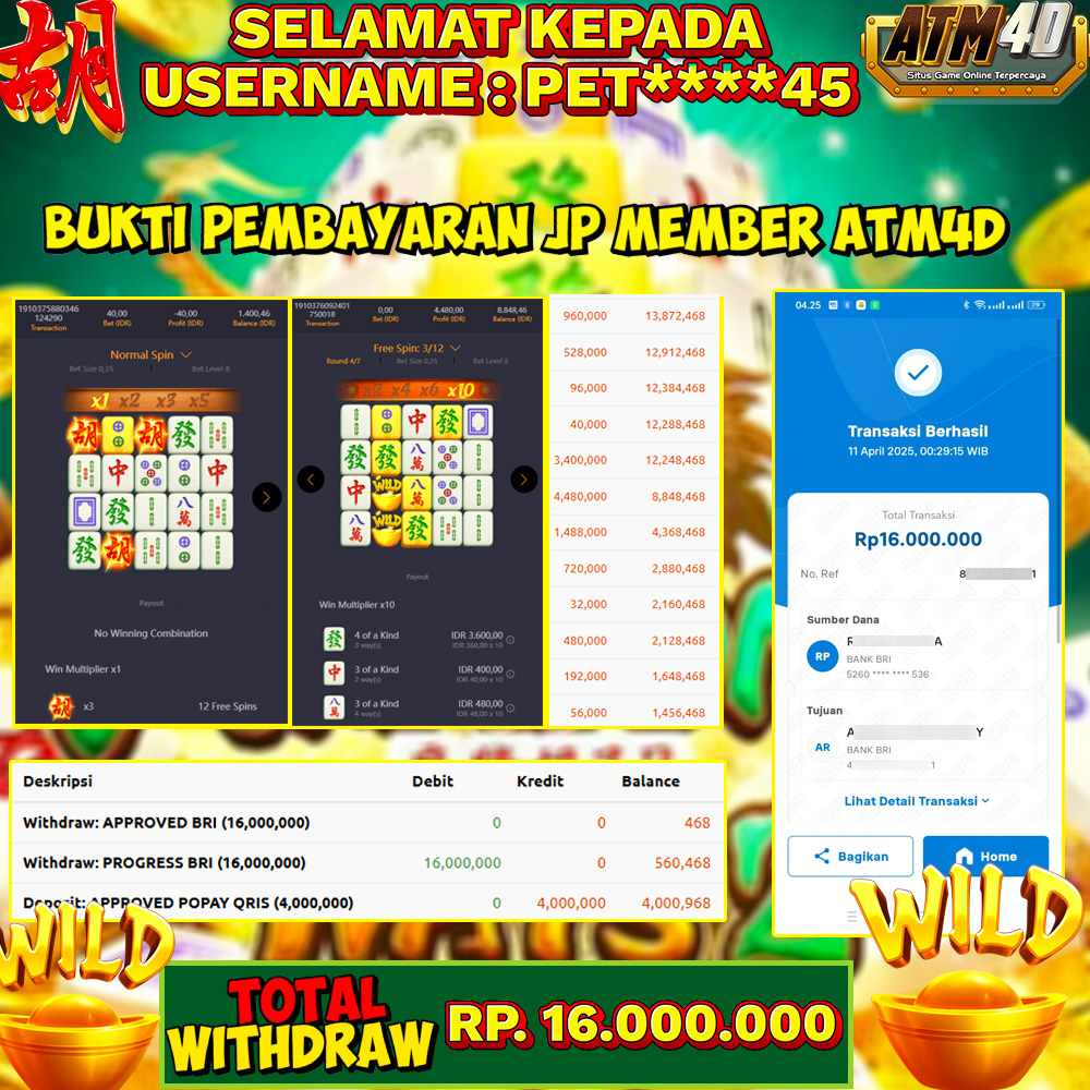 Selamat Kepada Member Yang Berhasil Mendapatkan Jackpot Dipermainan PG SOFT, Berikut Bukti Jackpot Member Di Situs ATM4D