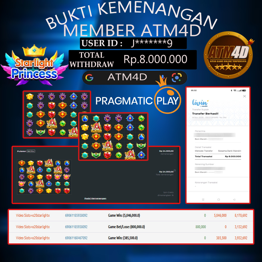 Selamat Kepada Member Yang Berhasil Mendapatkan Jackpot Dipermainan PRAGMATIC PLAY, Berikut Bukti Jackpot Member Di Situs ATM4D